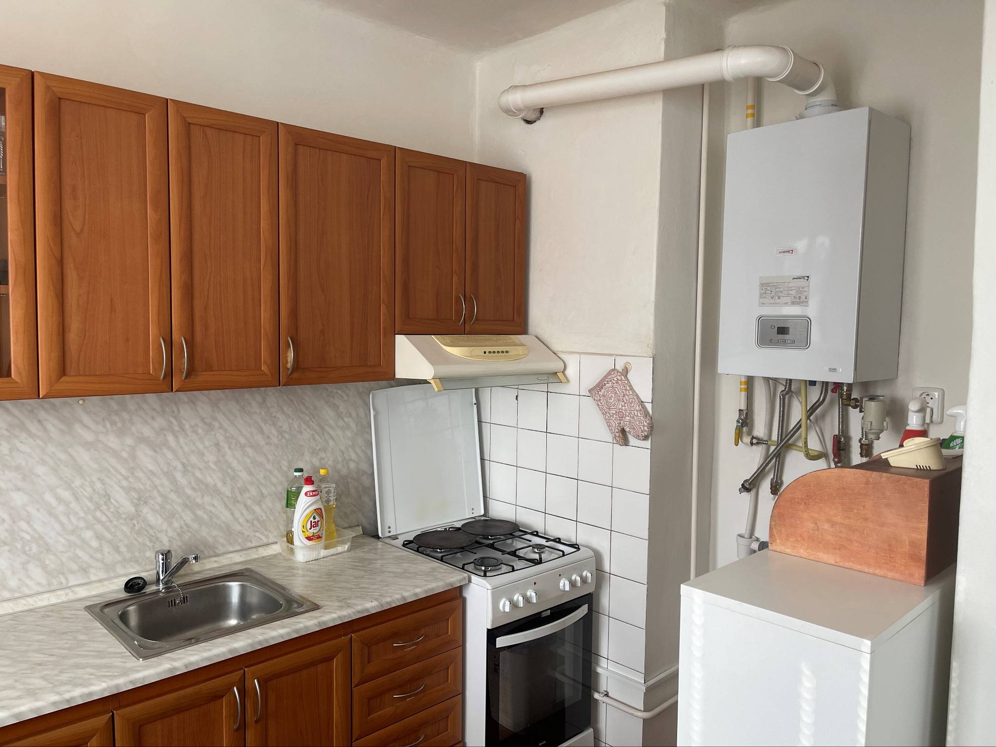 Teplú vodu a kúrenie zabezpečuje vlastný plynový kotol.
